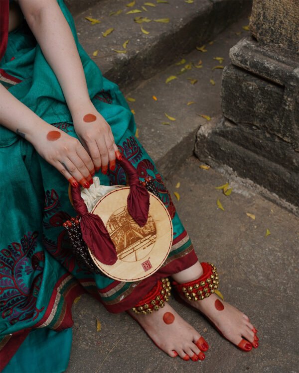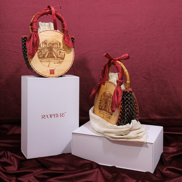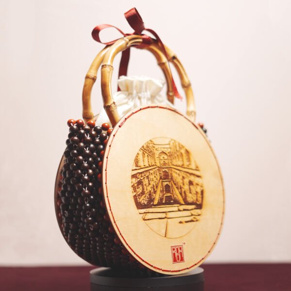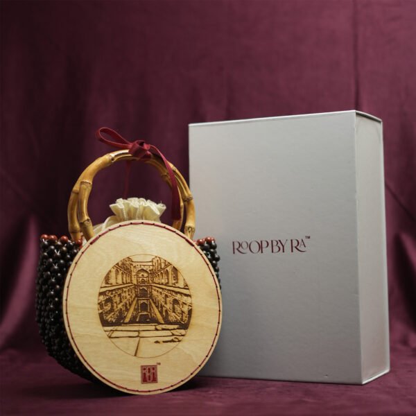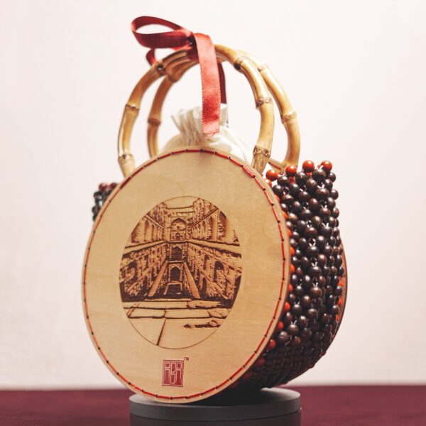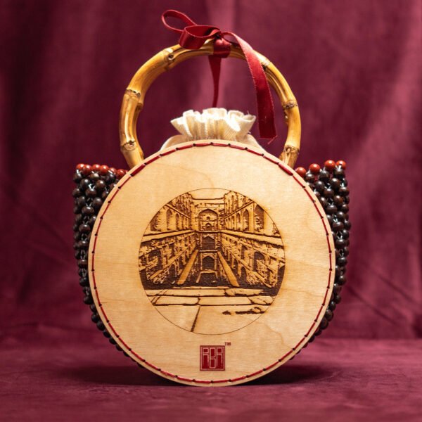From the numerous historical landmarks of DELHI, presenting AGRASEN KI BAOLI. Capturing the intricately carved pillars and arched niches that create a serene and mystical atmosphere. Crafted with meticulous attention to detail, it features bamboo handles adorned with delicately polished wooden beads and a beautiful red jasper border, with a soft velvet lining, supporting intricately carved wooden discs depicting a vivid glimpse of Agrasen Ki Baoli. Elevate your style with this handcrafted treasure that pays homage to India’s rich historical tapestry.